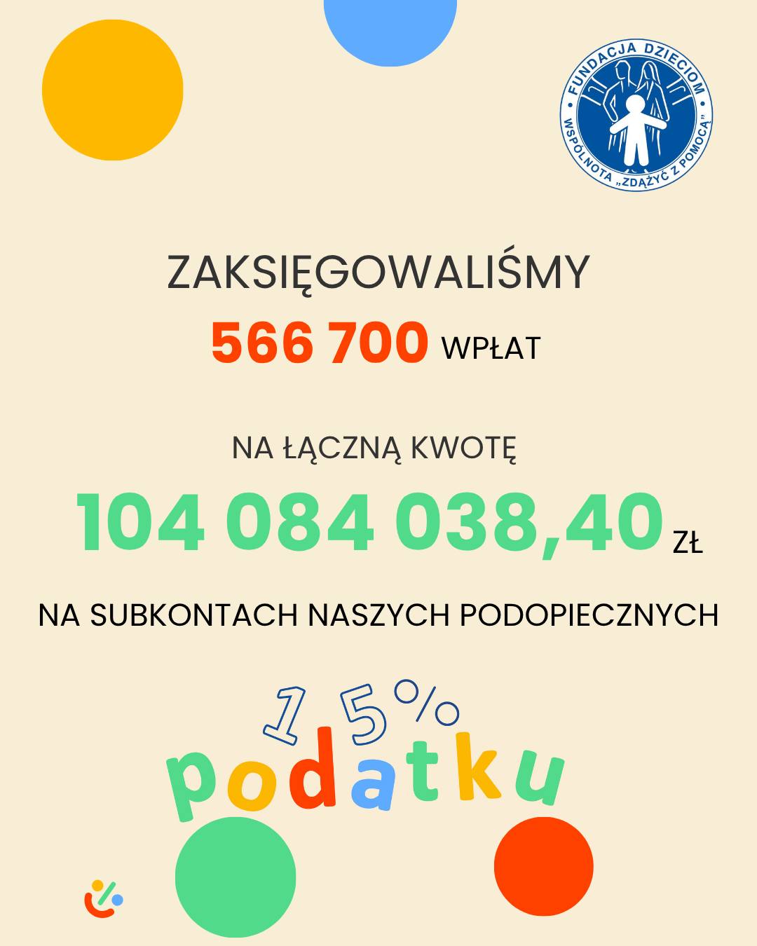 Informujemy, że zaksięgowaliśmy już wszystkich 566 700 wpłat wpłat z 1,5% podatku na łączną kwotę 104 084 038,40 zł.