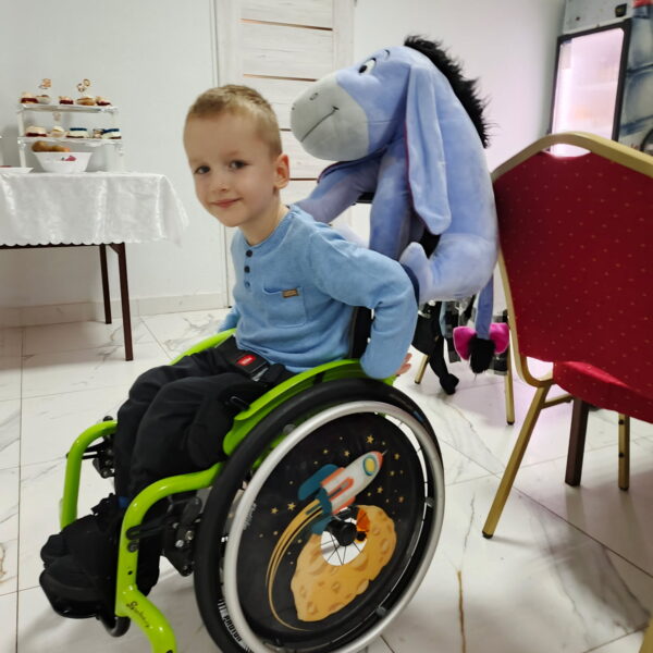 Dziś chłopiec robi ogromne postępy — choć jego mięśnie wymagają nieustannego wzmacniania, a intensywna praca nigdy się nie kończy. Mimo wyzwań, Olek jest bardzo pogodnym dzieckiem. Uwielbia bawić się ze starszym bratem i rówieśnikami, z radością odkrywa kolejne place zabaw, z fascynacją obserwuje pociągi i… kocha mambę, koniecznie zieloną! Jego ulubionymi zwierzętami są pawie!