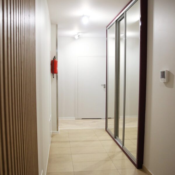 Goście mają do dyspozycji część jadalną z aneksem kuchennym oraz część wypoczynkową, wyposażoną w kanapę i fotel – obydwa meble mają funkcję spania. Za przesuwnymi drzwiami wyodrębniony jest pokój dla dziecka z jednoosobowym łóżkiem. W przedpokoju funkcjonalna szafa wnękowa. W przestronnej łazience znajduje się wanna i kabina prysznicowa. Apartament wyposażony jest w klimatyzację.