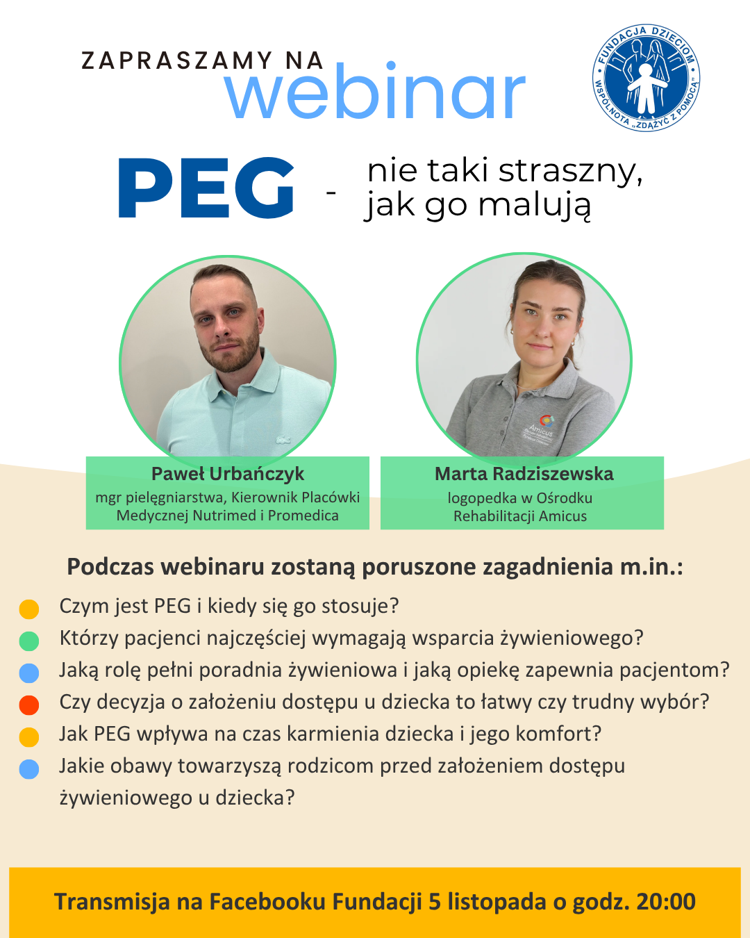 Zapraszamy na webinar „PEG – nie taki straszny jak go malują”. Już 5 listopada odbędzie się trzecie i zarazem ostatnie spotkanie z cyklu poświęconego wsparciu żywieniowemu. Tym razem gośćmi będą Paweł Urbańczyk – mgr pielęgniarstwa, Kierownik Placówki Nutrimed i Promedica – oraz Marta Radziszewska, logopedka z naszego Ośrodka Rehabilitacji Amicus.